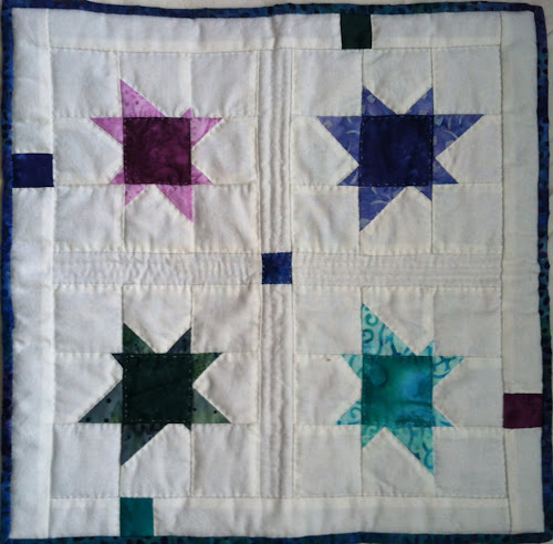 I had originally planned to make this first mini quilt a scrap quilt. I knew I would have to buy some white though. I got all my scraps out and had enough for three stars but couldn't find a good combination for a fourth.